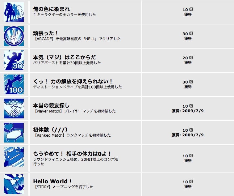 結局買った「ブレイブルー」、まあ早い話が「ギルティギア」のマイナーチェンジ版なんですけど、いつまでも同じ絵使い回すよりは良いんじゃないかと。システムも若干変わっていて、ギルティよりも投げが色んな局面で狙えて戦略上重要になっているのはちょっと「バーチャファイター」っぽい?強い人と対戦すると相変わらず何も出来なくなってしまうのは相変わらずですが。実績は遊べば取れるもの2つ。まだ始めたばかりなのでとりあえず色んなキャラを触ろう。