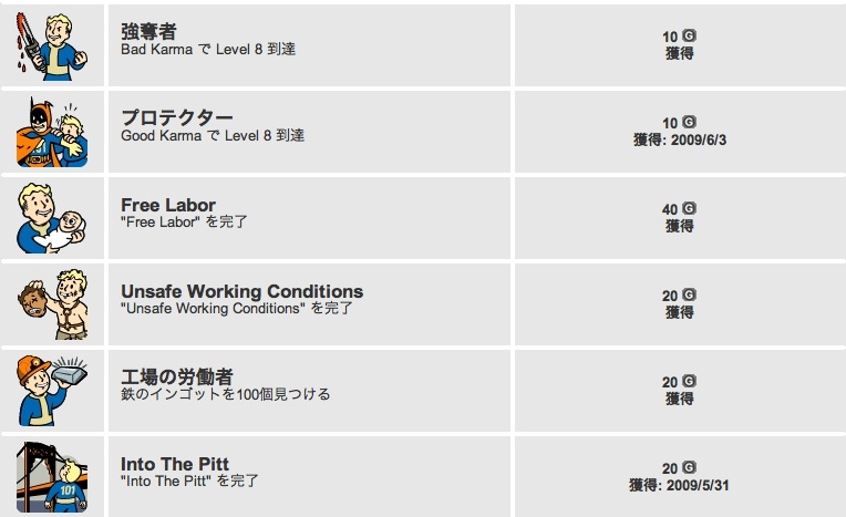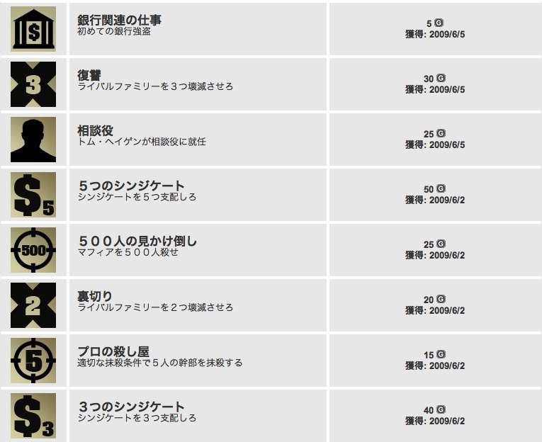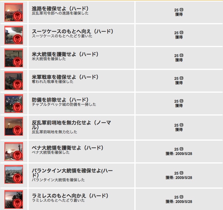 5月30日時点で29695G…なんだけど、あれれ?前回のと今回の実績を足すと25G足りない?これは何の25Gだ?全く覚えがない…(可能性としては前回の集計で何かを足し忘れているのが濃厚)。オフラインでも遊ぶときがあるから取った日にちが記憶されないのがあるけど、その時取った実績はメモってるから大丈夫、のはずが、漏れがあったみたい。今度から気をつけよう。あと、「ゴッドファーザー2」の実績で「2009/5/17獲得」って表記がある実績、あれ全部「2009/4/17」に獲得したんだけど…?わけがわからん。どうなってんだ?