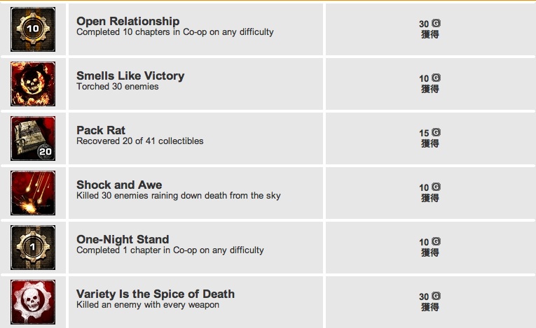 確保し直した「ギアーズオブウォー2」。友人との協力プレイ関連の実績をいくつか獲得。最高難易度はやっぱ協力プレイが一番だな。瀕死状態で仲間に蘇生させてもらえるので、一人プレイより遥かに楽になる。即死ポイントじゃ意味ないけどね。