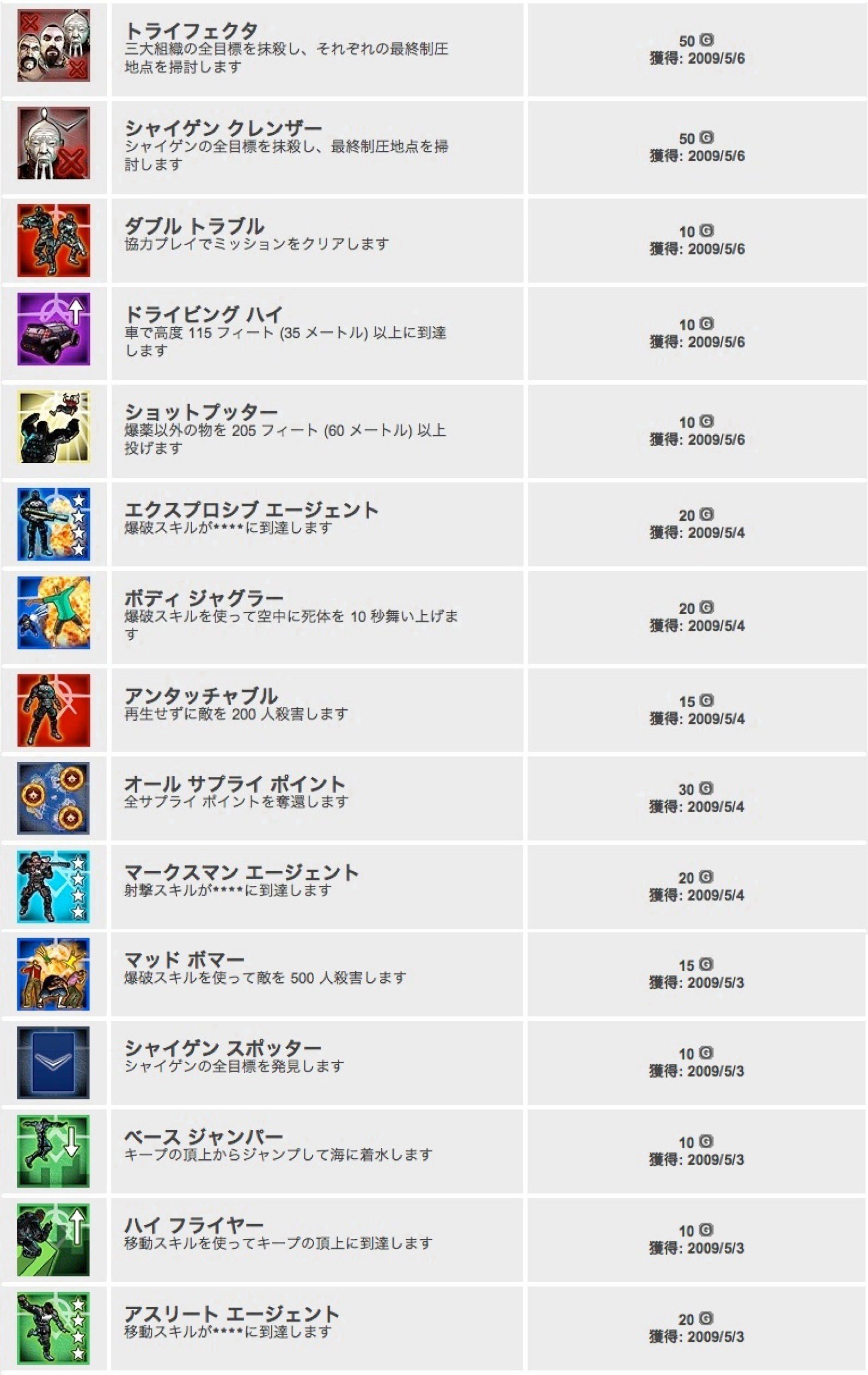 見てわかる通り、思い出したかのようにずっと遊んでいた「ライオットアクト」で一番稼いでいますね。このゲーム、今使っているタグとは別タグで遊んでいた過去があり、そのため今のタグでは獲得実績が少なかったのですが、実績欲しさに再プレイ。正直、「ライオットアクト」は「Halo3」のベータをやりたいがために買いましたが…それを抜きにしてもすごく面白いので買って良かったですね。今回は一通りキャンペーンモード一周クリアをしたので、単体(トライフェクタ、シャイゲンクレンザー)での実績値も多いです。しかもこのプレイ中、他のユーザーから協力プレイの申し出があって、いっしょに遊んだため、「ダブルトラブル」の実績も取れて一石二鳥。最後の目標も、協力プレイのお陰で簡単にクリアできました。「時間をかければいつかは取れる」実績(アスリートエージェントなど)以外の細かい実績は、完全に実績プレイで取りました。「ハイフライヤー」を取れば、ついでに「ベースジャンパー」もその帰りで取れるので、この二つの実績はおいしかったです。「ドライビングハイ」も、高層ビルのエレベーターに車を載せてそのま上昇すれば取れるので楽です。「ライオットアクト」は、これ以外にもそこそこ楽に取れそうな実績がいくつもあるので、来週も挑戦しようと思います。