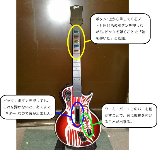と、いうことで、第一回目の今回は「ギターヒーロー」で遊んでいる様子を紹介。まずは専用ギターコントローラーの簡易説明。ちなみに、このコントローラー、ワイヤレスなので非常に使い易いです。大きさも手頃で良い。ギブソン(ギターを作っているメーカー)のレスポールモデルという有名なギターの形をしています。(メーカーからライセンス取得済み)