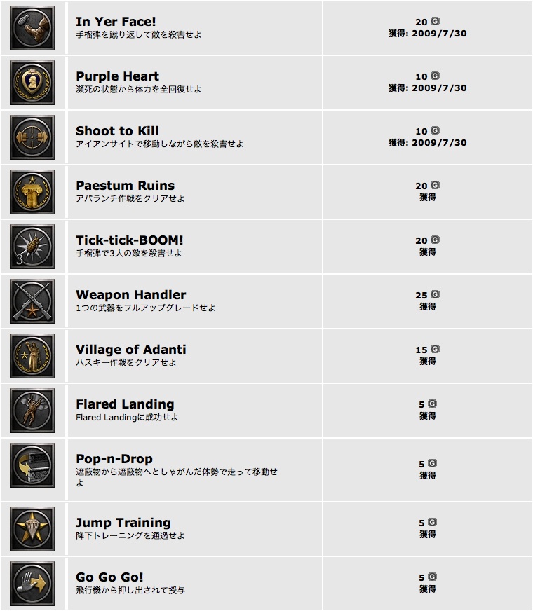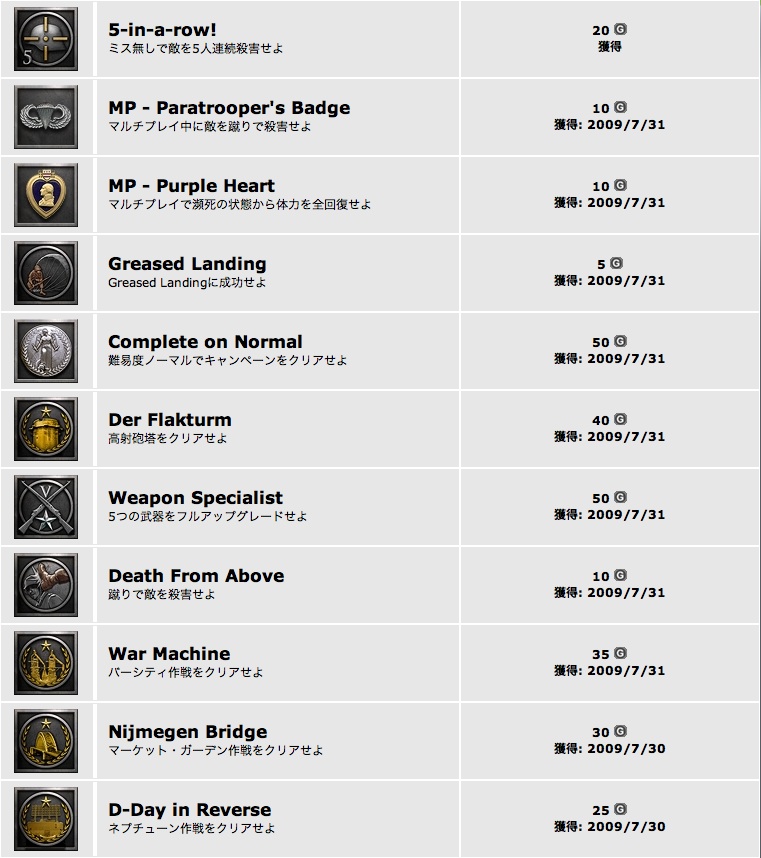「メタルオブオナー:エアボーン」もやっと購入。一通りクリアして獲得した実績です。空から降下して敵陣地に赴くのが魅力のゲームですが、各武器に経験値が設定されていて、武器がどんどん強化されていくのも面白いですね。例えばライフルだと、レベルが上がるたびに「リロード速度上昇→装弾数アップ→スコープ追加」みたいな感じです。ノーマルを一通りクリアしましたが、イージーでクリアの実績が開いていないので、次はそれを二周目で取ろう。