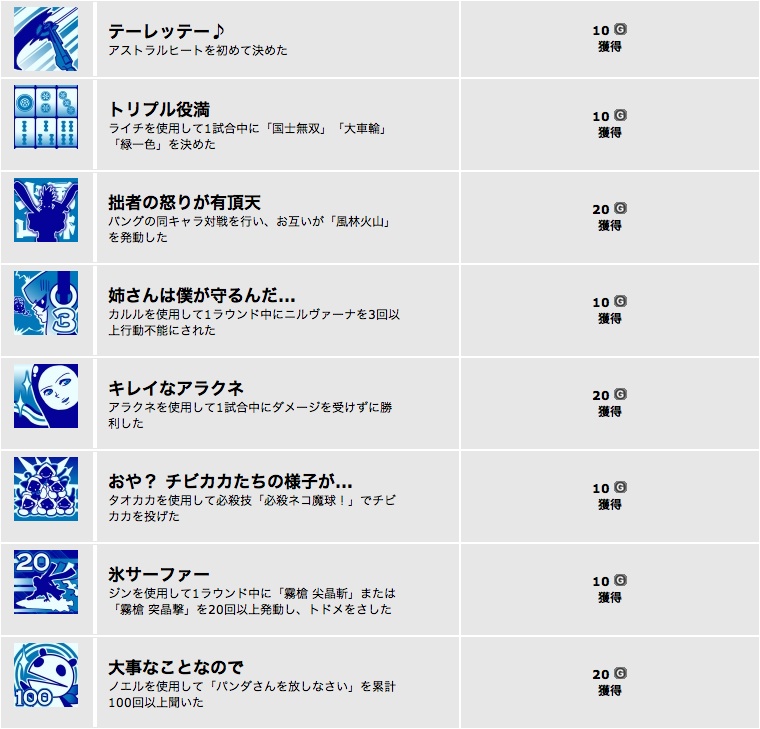 「ブレイブルー」は各キャラの特定行動実績。コントローラーを二個繋げて、一人二役で取りました。作業です。